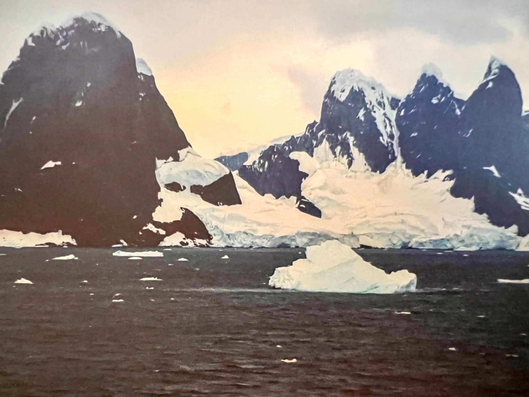 Zum Abschied von dieser in jeder Beziehung so eindrucksvollen Region gehe ich das Deck lange in alle Richtungen ab, um der ruhigen, kalten Eis- und Berglandschaft bei durchdringend hellem Sonnenschein außer der großen Ruhe, die zwar vom leisen Plätschern des im Moment ruhigen Meeres begleitet wird, noch etwas abzugewinnen. Die gewaltigen Bergmassive links und rechts werfen kaum Schatten, da die Sonne immer noch fast senkrecht über uns steht, als leuchtend gelb rötlicher Ball. Gewaltige Tafelberge aus Eis, wie mit einem gewaltigen Messer herausgeschnitten, liegen neben uns und werden von der Strömung fortgezogen.